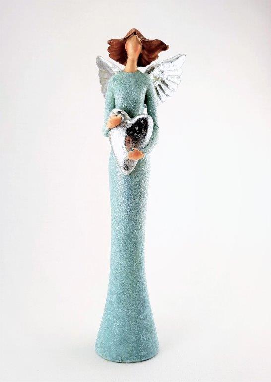 Soška andělské víly v krásné barvě karibské modro-zelené se stříbrnými křídly, držící velké stříbrné srdíčko, barva šatů lehce třpytivá