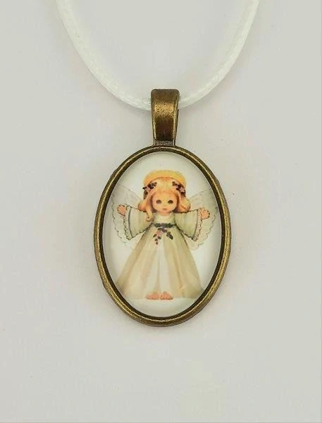 Oválný medailonek ANDĚLSKÁ HOLČIČKA V BÍLÝCH ŠATECH - zavěšený na bílé šňůrce se zapínáním na karabinku o délce ca. 47-52 cm