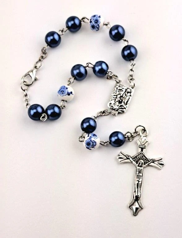 Desátek, jednodekádní růženec s modrými perličkami a křížkem.