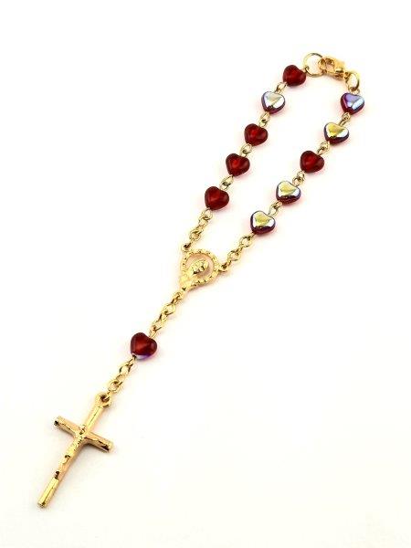 AUTORŮŽENEC - jednodekádní růženec - skleněná červená srdíčka s AB leskem, zapínání na karabinku. Barva kovu zlatá