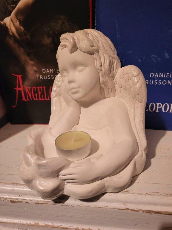 Andílek s miskou na svíčku, nebo na drobnosti... barva bílá s lehce stříbrným nádechem