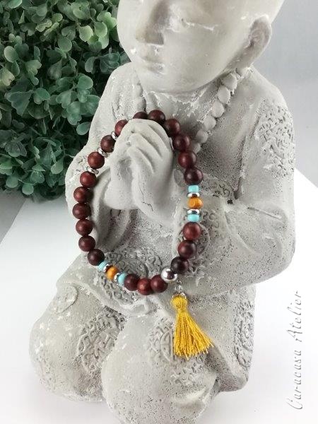 Budhistický modlitební náramek a stylový doplněk v jednom - vyrobený z kuliček vzácného tropického dřeva Palisandru, doplněný zlatým střapcem.