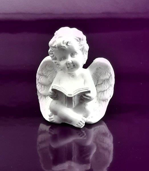 Soška malinkého andílka držícího knížku, velikost 4 cm, materiál keramický prášek, použití pouze v interiéru.
