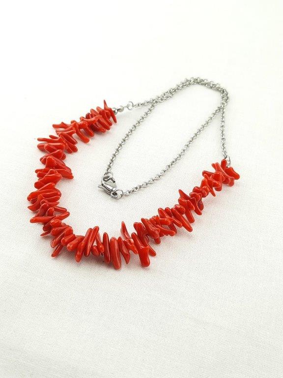 Náhrdelník tvořený z červených větviček korálu a řetízku z chirurgické oceli - obvod 48 cm, zapínání na karabinku.