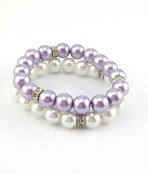 Sada dvou elastických náramků z bílých a lila větších perliček (10 mm), zdobených šatony.