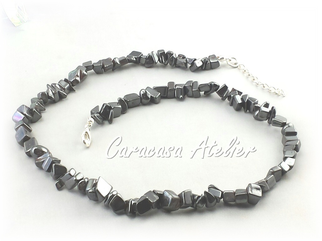 Náhrdelník z HEMATITU délka 45 - 49 cm, zapínání na karabinku, kov stříbřený tombak.