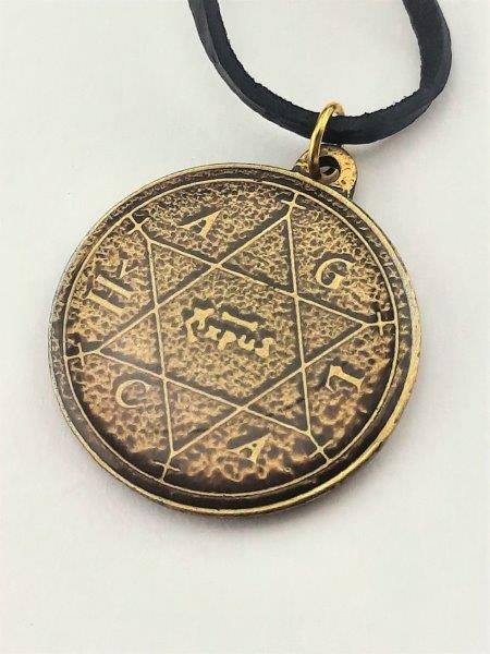 Šalamounův pentakl - mince včetně hnědo-černé voskované šňůrky k zavěšení na krk, nebo do prostoru – tento amulet přináší rovnováhu mysli, dobrou náladu a klid v duši. Slouží k posílení víry ve vlastní schopnosti, k růstu vitality a energie. Dává radost a spokojenost v průběhu celého týdne. Zahání smutek, způsobuje otevřenost především pro pozitivní věci a naplňuje optimismem.