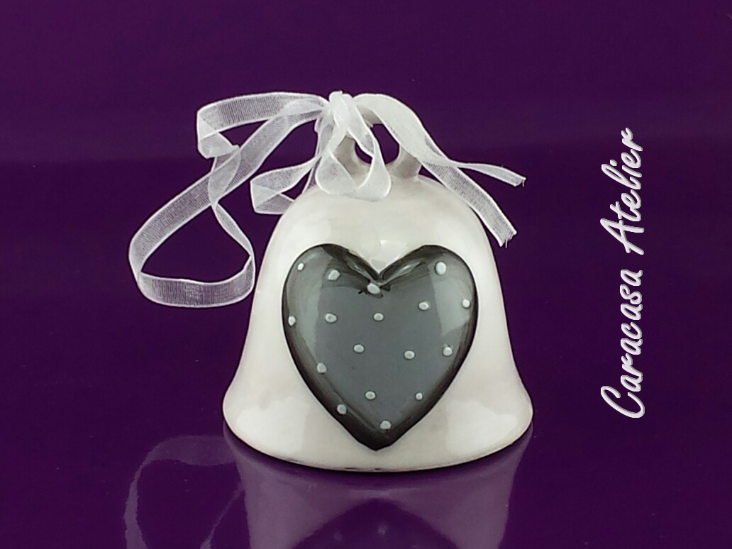 Pěkný keramický zvonek s motivem srdíčka v šedé barvě, výška zvonečku 7,5 cm