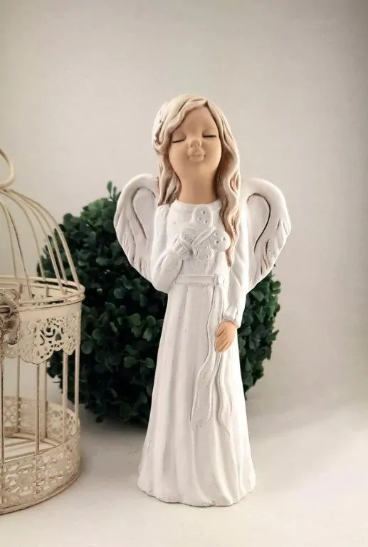 Soška roztomilého andílka v bílých šatečkách s motýlkem, velikost 27 cm
