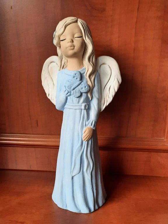 Soška roztomilého andílka v modrých šatečkách s lehce třpytivým motýlkem, velikost 27 cm