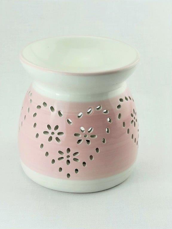 Romantická aromalampa pro odpařování éterických olejů ve vodě, nebo vonných vosků, barva bílá a světle růžová, s průřezy ve tvaru kytiček a srdíček.