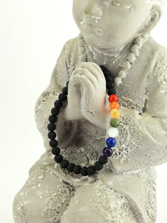 Čakrový náramek z drobnějších kuliček (6mm) obsahuje: korál červený, jadeit, akvamarín, karneol, citrín, lapis lazuli, ametyst a lávové kameny