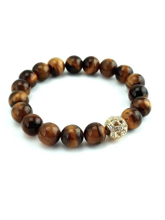 Náramek z velkých kuliček tygřího oka (10mm) s ozdobným doplňkem z chirurgické oceli zlaté